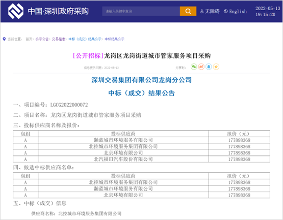 兩標20億元,北控城市服務“城市大管家”之路越走越寬廣。深圳政府采購網消息,2022年5月13日,深圳市龍崗區(qū)平湖街道城市管家服務項目公布中標結果,在與北京環(huán)境有限公司、瀚藍城市環(huán)境服務有限公司、北汽福田汽車股份有限公司的同場較量中,北控城市環(huán)境服務集團有限公司成功勝出。成交信息如下:供應商名稱:北...