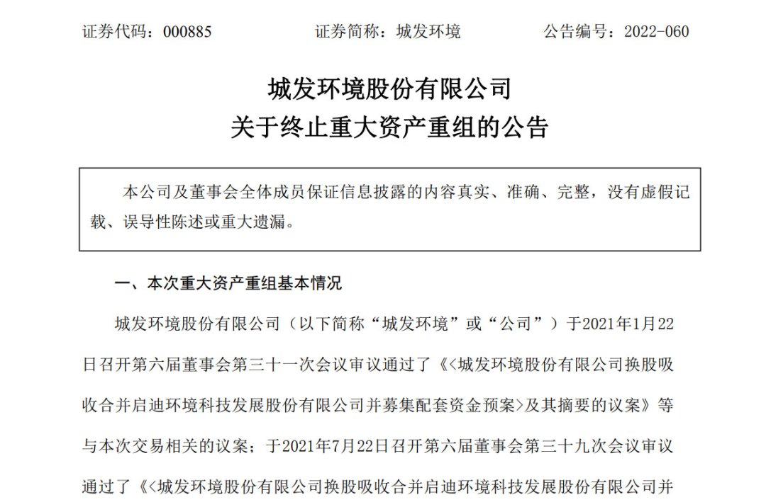 關注 | 城發(fā)環(huán)境終止吸并啟迪環(huán)境,“黃河環(huán)境”涼涼了?