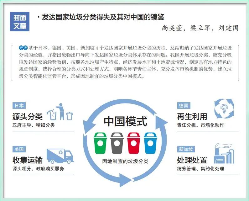 本文亮點(diǎn)在綜述了發(fā)達(dá)國(guó)家垃圾分類(lèi)開(kāi)展進(jìn)程的基礎(chǔ)上,分析了不同國(guó)家選擇不同分類(lèi)方式和處理方式的原因,指出了廢物出口導(dǎo)向下發(fā)達(dá)國(guó)家垃圾分類(lèi)體系存在的問(wèn)題,進(jìn)而總結(jié)了我國(guó)需要吸取的經(jīng)驗(yàn)教訓(xùn),為我國(guó)開(kāi)展垃圾分類(lèi)提出了建議。內(nèi)容簡(jiǎn)介及結(jié)論近年來(lái),我國(guó)不斷推進(jìn)垃圾分類(lèi)工作的深入開(kāi)展,46個(gè)重點(diǎn)城市已逐步建成垃圾...