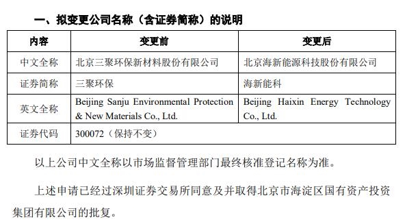 2022年6月29日,北京三聚環(huán)保新材料股份有限公司發(fā)布了《關(guān)于擬變更公司名稱(chēng)(含證券簡(jiǎn)稱(chēng))的公告》。 即,“北京三聚環(huán)保新材料股份有限公司”變更為“北京海新能源科技股份有限公司”,證券簡(jiǎn)稱(chēng)從“三聚環(huán)保”變更為“海新...
