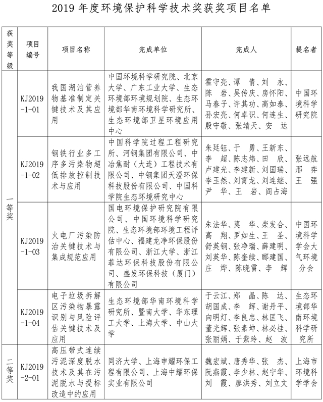 根據(jù)《環(huán)境保護(hù)科學(xué)技術(shù)獎勵辦法》的規(guī)定,經(jīng)有關(guān)專家、單位提名和專家評審,并通過廣泛公示,環(huán)境保護(hù)科學(xué)技術(shù)獎勵委員會批準(zhǔn)39個項(xiàng)目獲2019年度環(huán)境保護(hù)科學(xué)技術(shù)獎,其中:一等獎4項(xiàng),二等獎33項(xiàng),科普類獎2項(xiàng)。 附:2019年度環(huán)境保護(hù)科學(xué)技術(shù)獎獲獎項(xiàng)目名單 環(huán)境保護(hù)科學(xué)技術(shù)獎勵辦公室 2019年12...