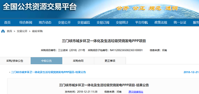 2018年12月21日,河南省三門峽市城鄉(xiāng)環(huán)衛(wèi)一體化及生活垃圾焚燒發(fā)電PPP項目發(fā)布結果公告,結果具體如下: 一標段預中標社會資本方: 單位名稱:北京環(huán)境有限公司(牽頭人)、北京中科仁和環(huán)??萍加邢薰?聯(lián)合體成員) 報價大寫:壹億零伍佰玖拾捌萬捌仟玖佰玖拾伍元叁角貳分每年 小寫:¥10598899...
