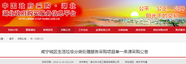 湖北咸寧城區(qū)生活垃圾分類處理服務(wù)采購項目發(fā)布單一來源采購公告,擬選擇啟迪桑德環(huán)境資源股份有限公司為單一來源供應(yīng)商,項目預(yù)算500萬。 據(jù)悉,2016年10月,咸寧市人民政府授權(quán)咸寧市城市管理執(zhí)法局與啟迪桑德環(huán)境資源股份有限公司簽訂了《咸寧市城區(qū)環(huán)衛(wèi)作業(yè)PPP項目特許經(jīng)營權(quán)協(xié)議》。 城市生活垃圾分類收...
