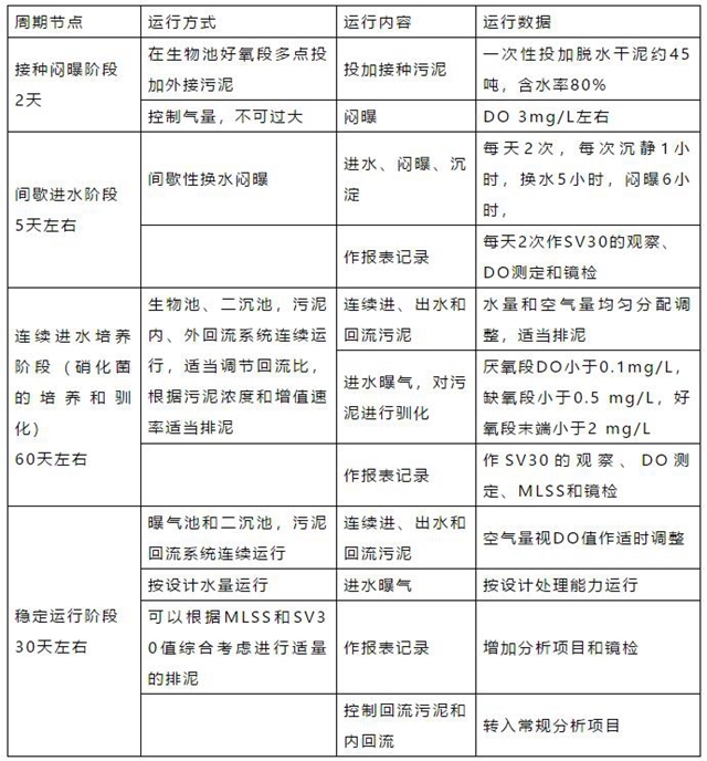 本手冊是針對氧化溝工藝調(diào)試工作編寫的,可供污水調(diào)試及營運工作人員使用! 1、污泥接種 接種污泥應采用附近城市市政污水處理廠的剩余污泥,為減輕運輸壓力應取脫水干化后的污泥。污泥投加量為池容的5%以上,一般先在一組氧化溝中培養(yǎng),培養(yǎng)成功后通過回流污泥泵打入第二組氧化溝繼續(xù)培養(yǎng)活性污泥。 2、污泥馴化 第...