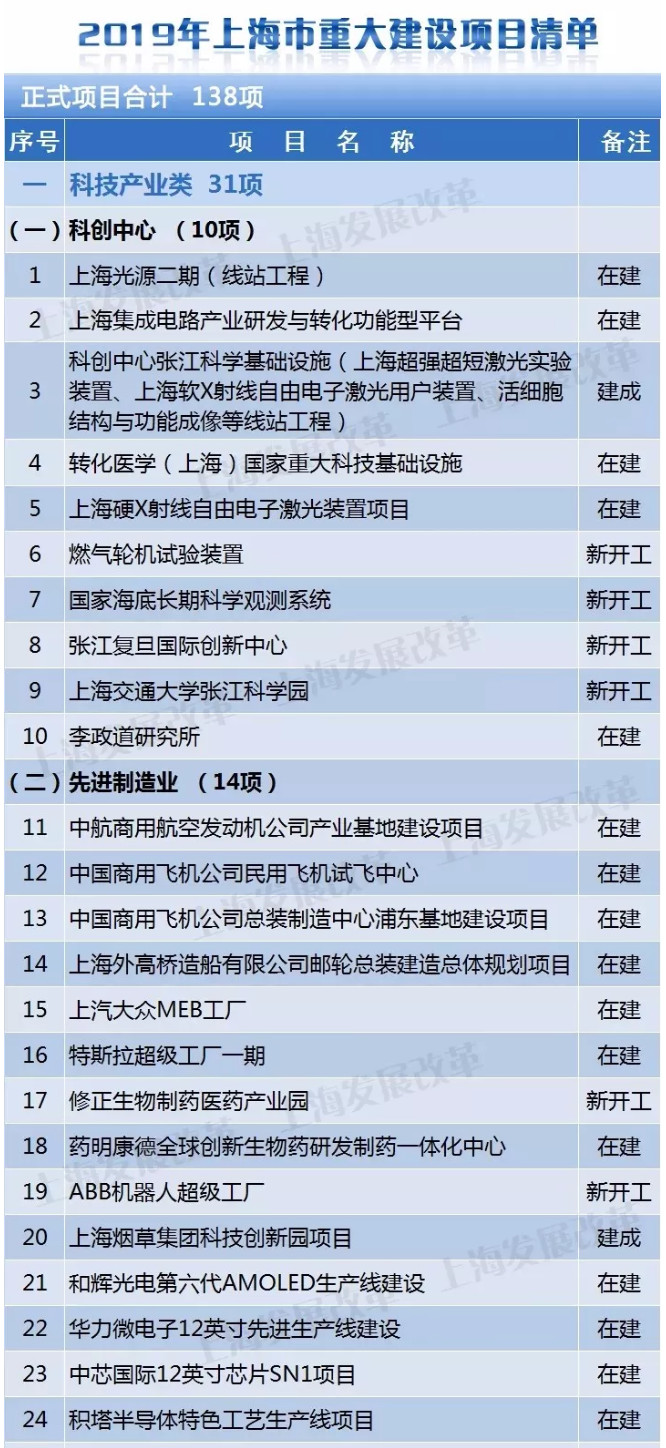 上海市發(fā)改委今天公布2019年重大建設(shè)項目清單:今年上海市重大建設(shè)項目分為產(chǎn)業(yè)科技、社會民生、生態(tài)文明、城市基礎(chǔ)設(shè)施、城鄉(xiāng)融合與鄉(xiāng)村振興等五大領(lǐng)域→特斯拉超級工廠一期、固體廢物處置項目、污泥處理項目等等,你關(guān)心的建設(shè)項目在這里嗎?部分清單詳見下文↓產(chǎn)業(yè)科技類(31項)在建25項。其中,科創(chuàng)中心張江科...