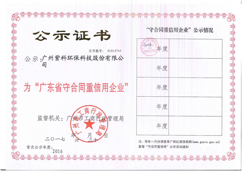 近日,順利通過省工商行政管理局評審,獲得2016年度廣東省“守合同重信用企業(yè)”,此舉肯定了紫科環(huán)保誠信守約經(jīng)營、信用文化建設(shè)與良好的客戶口碑。“廣東省守合同重信用企業(yè)”獲評企業(yè),均為有實力的誠信標(biāo)桿企業(yè)。它是由廣東省工商行政管理局評定頒發(fā)的,用于鼓勵企業(yè)加強合同和信用管理,促進當(dāng)?shù)仄髽I(yè)信用體系建設(shè)。...