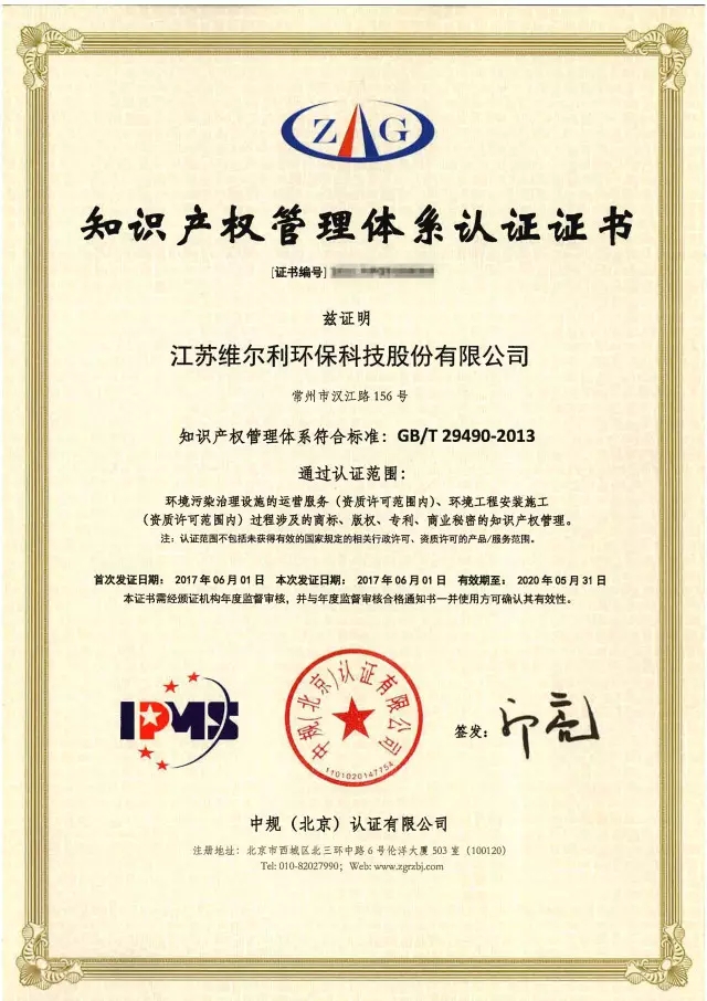 2017年6月,江蘇維爾利環(huán)??萍脊煞萦邢薰卷樌ㄟ^認(rèn)證,獲得GB/T29490-2013知識產(chǎn)權(quán)管理體系認(rèn)證證書。知識產(chǎn)權(quán)管理體系是國家知識產(chǎn)權(quán)局牽頭制定的一項國家標(biāo)準(zhǔn),旨在幫助企業(yè)建立科學(xué)、標(biāo)準(zhǔn)化的知識產(chǎn)權(quán)管理制度,形成貫穿生產(chǎn)經(jīng)營各環(huán)節(jié)的知識產(chǎn)權(quán)管理體系,實現(xiàn)對知識產(chǎn)權(quán)的獲取、維護、運用和保...